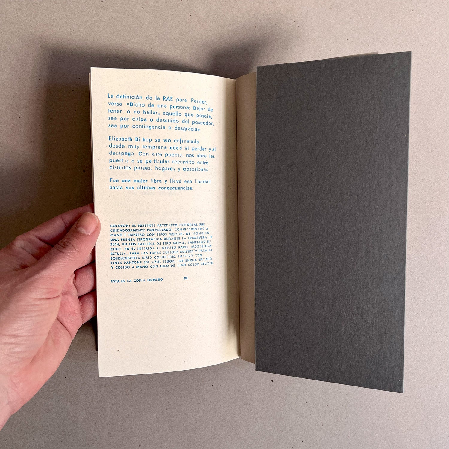 Hace algunos años un amigo tipógrafo me mostró a Elizabeth Bishop, hablábamos de poesía, de dolores y de pérdidas y llegamos a un poema: “El arte de perder”. Conversamos largo rato precisamente del perder, de abrazar las pérdidas, y de practicar perder para no sentir tanto dolor. Elizabeth lo escribió mejor que nosotroxs —pierde algo todos los días […] luego practica perder un poco más— nos dice, practicar con cosas pequeñas y simples para luego soportar las más grandes.
