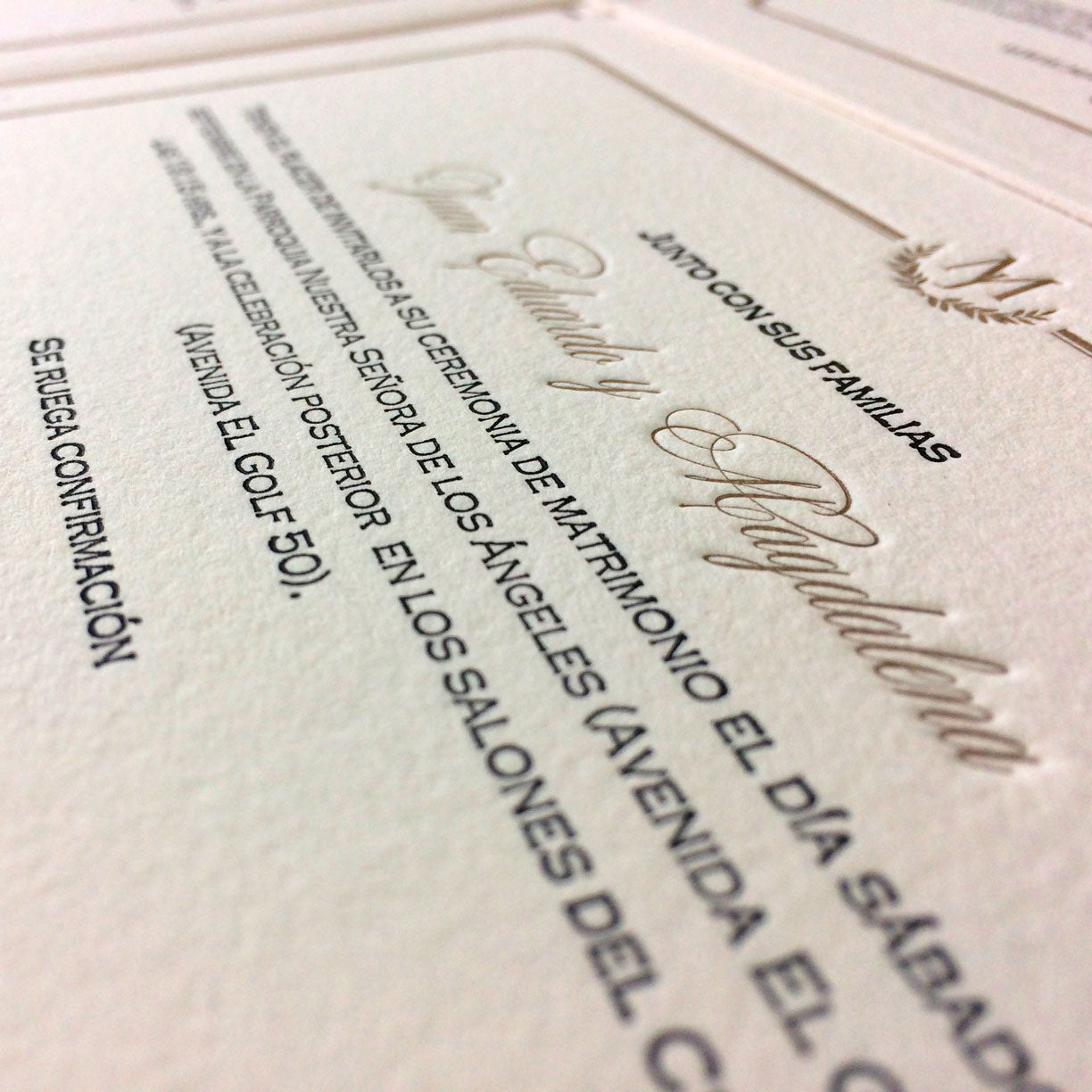 Impresión de invitaciones o partes de matrimonio sobre papel Crane´s Lettra Soft White 100% algodón, de 595 grs. Impresos por una cara del papel. No incluye el diseño*. Puedes imprimir con 1 o 2 tintas (colores). Si quieres utilizar 1 color + 1 cuño seco (impresión sin tinta) debes seleccionar dos colores.